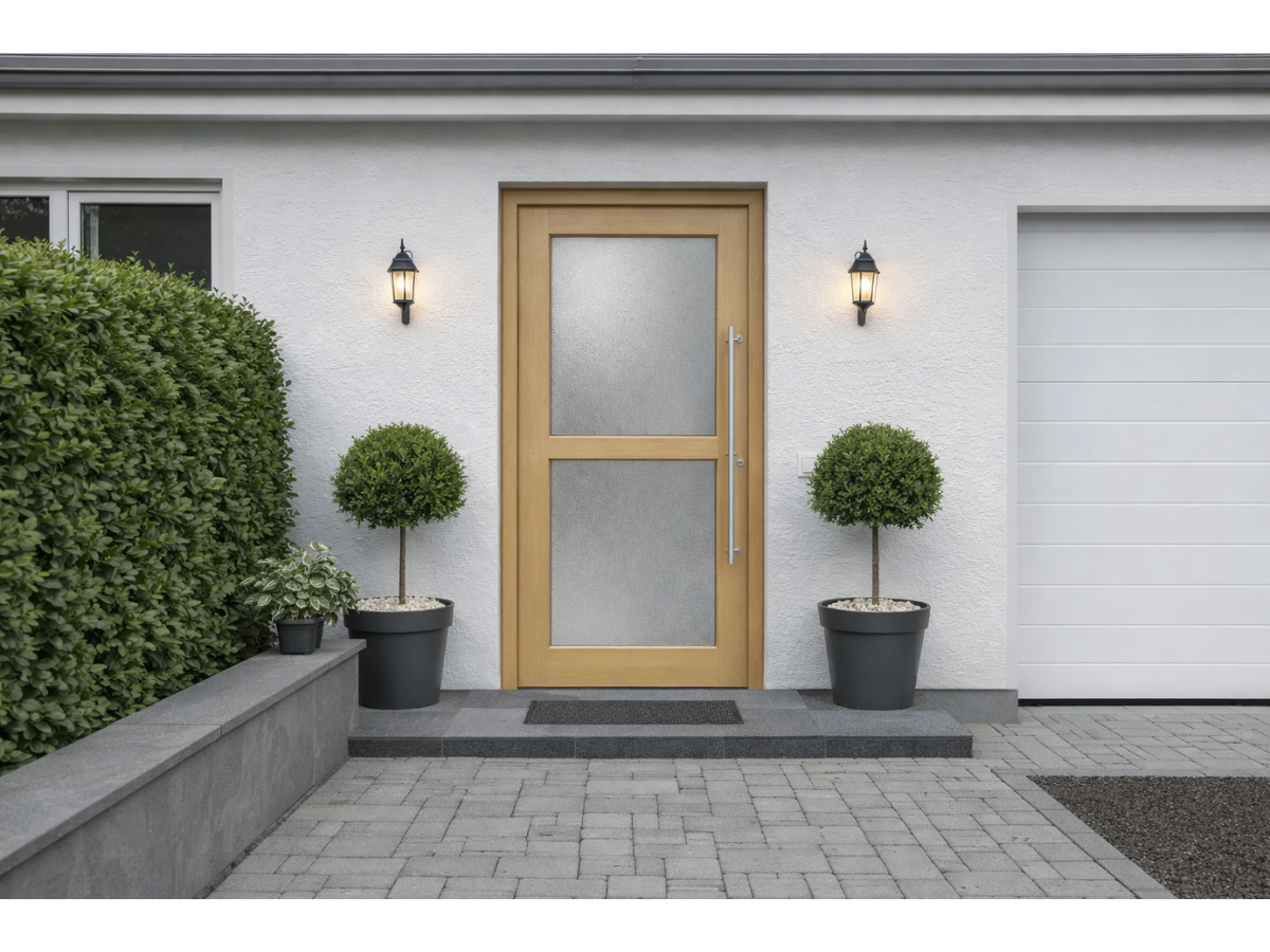 Diese elegante Haustür aus Holz besticht durch ihre schlichte Formensprache und den senkrechten Glasausschnitt, der natürliches Licht in den Eingangsbereich bringt und eine moderne Optik erzeugt. Die Haustür ist konfigurierbar in Abmessungen, Holzart, Farbton und Verglasung – wählbar in Kiefer, Eiche oder Meranti, deckend lackiert oder lasiert, passend zu klassischer wie moderner Architektur. Holz überzeugt durch natürliche Ausstrahlung, Dämmwerte und Stabilität, die fachgerechte Verarbeitung sorgt für Formbeständigkeit und Wetterfestigkeit.